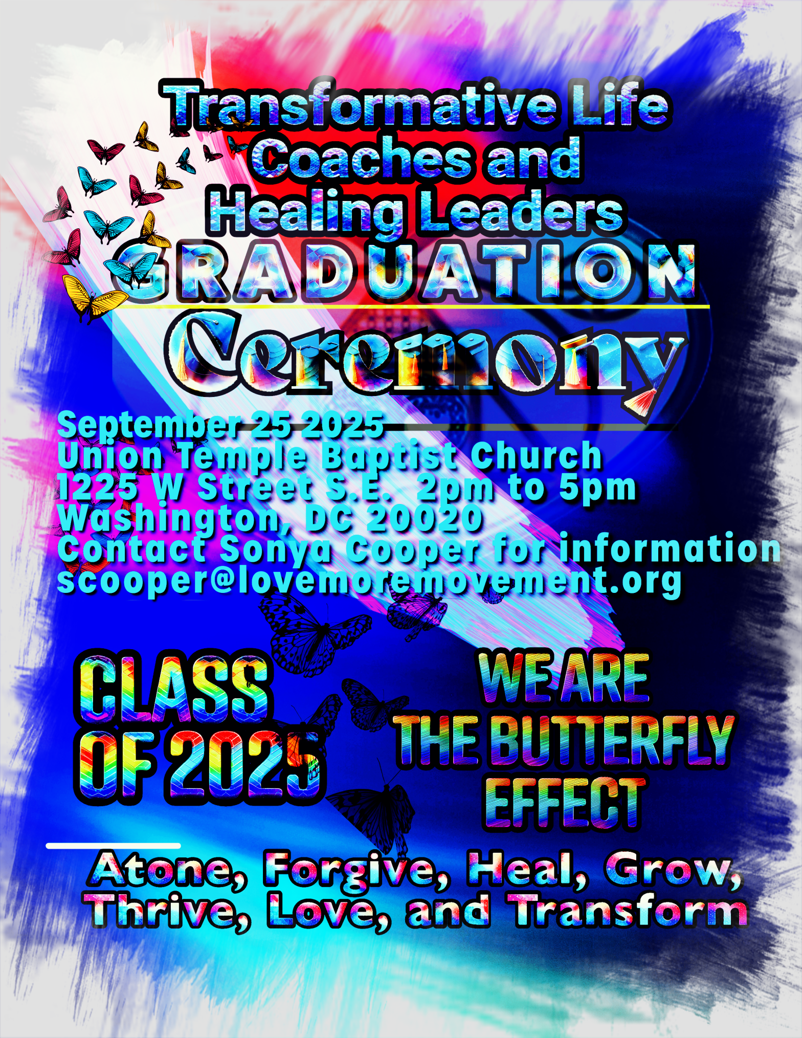 Celebrate Transformation with Us! Join us as we celebrate the graduates of the Transformative Life Coaches & Healing Leaders (TLiCHL) community, healers dedicated to bringing Love, Healing, Forgiveness, and Transformation to ourselves, our families, and our communities. Thursday, September 25, 2025 2:00–5:00 PM Union Temple Baptist Church 1225 W Street S.E., Washington, DC 20020 Reception to follow 5:00 – 7:00 PM at Sycamore & Oak in the Love More Store, 1110 Oak Dr SE, Washington, DC 20032. Can’t be with us in person? Join us live: Facebook: facebook.com/uniontempledc YouTube: youtube.com/@UnionTempleDC Instagram: IG @UnionTempleDC Witness the pinning of new life coaches. Celebrate transformation in action. Join us in Birthing Our Butterflies.